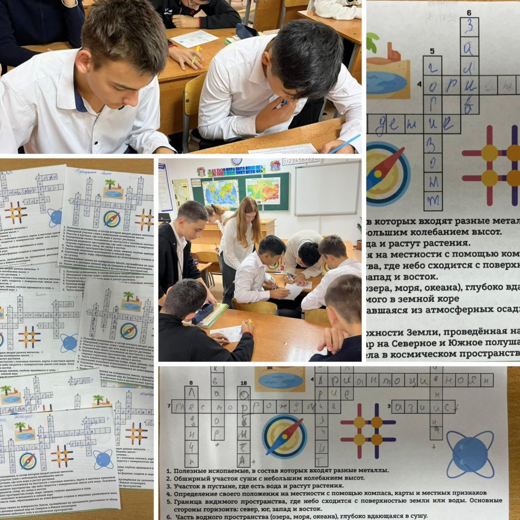 «Әлем әлемі», «Географиялық терминдер» және «Материктер бойынша саяхат» тақырыптары бойынша географиялық кроссвордтар
