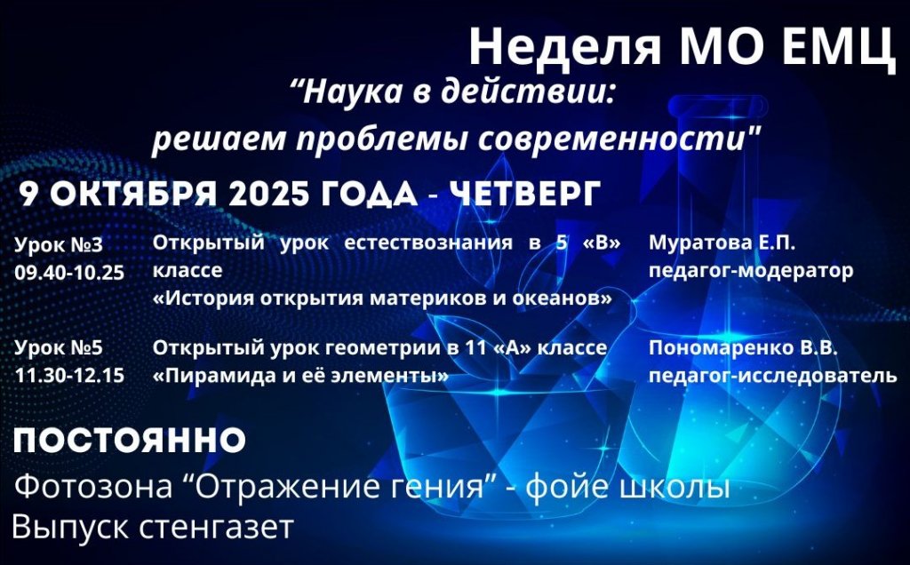 9 октября в рамках декады: «Наука в действии: решаем проблемы современности» в 11А классе под руководством педагога-исследователя Вадима Викторовича Пономаренко прошел открытый урок по геометрии на тему «Пирамида и её элементы». Используя авторскую разработку...