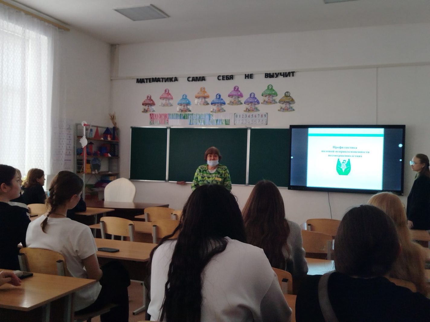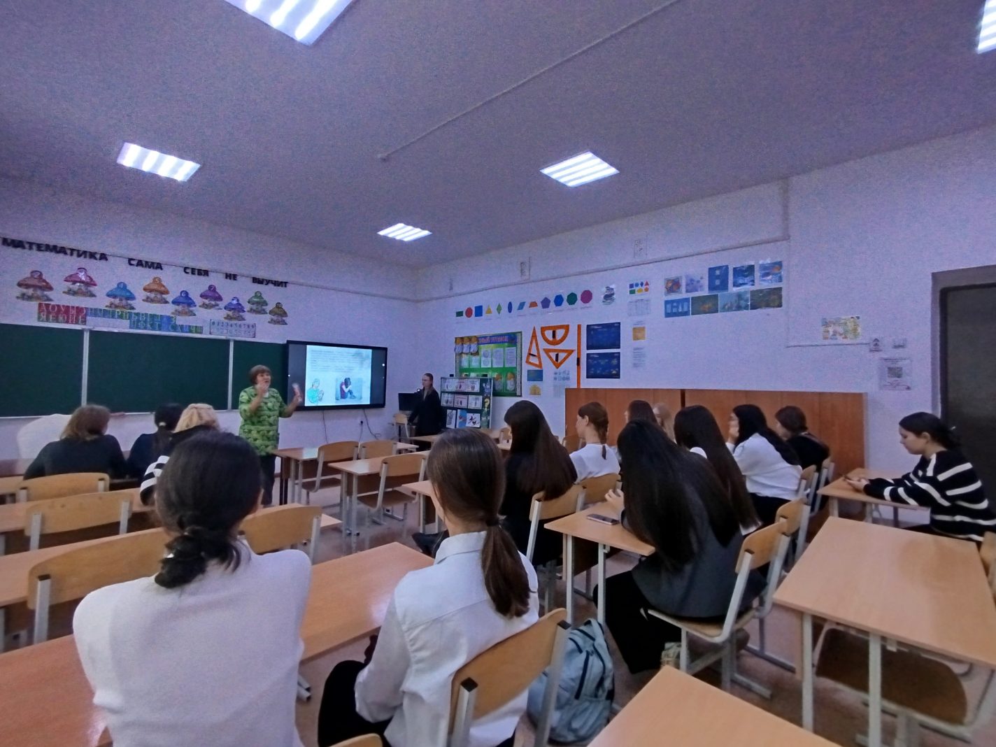 Материалды көрнекі түрде қабылдау үшін оқушыларға негізгі деректерді, мамандардың кеңестерін және профилактикалық материалдарды қамтитын тақырыптық презентация көрсетілді.