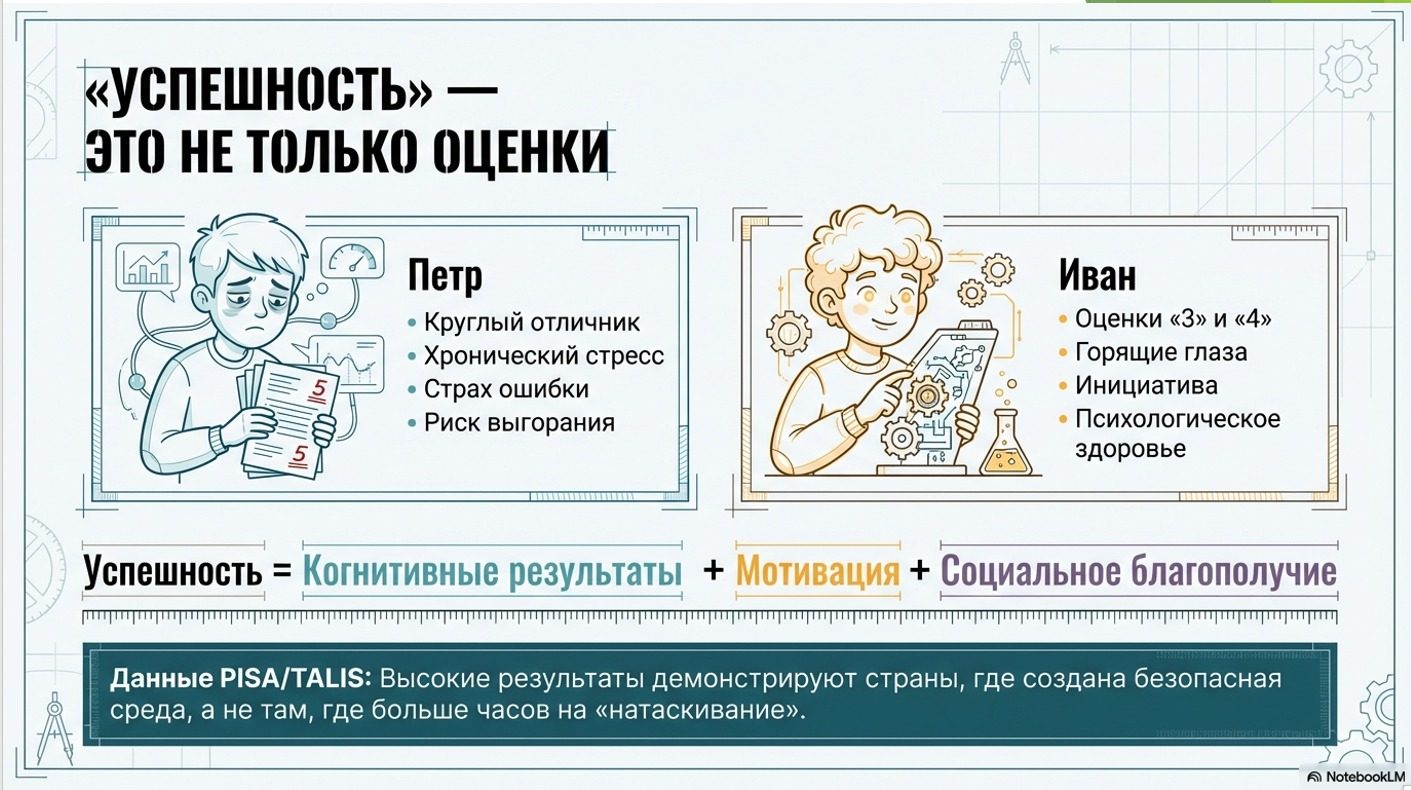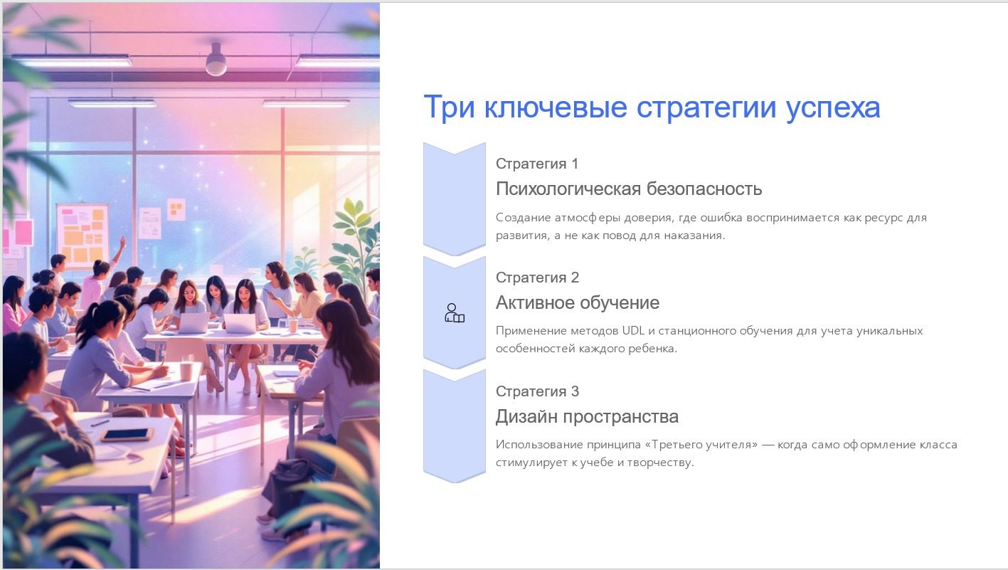 Особое внимание уделено созданию психологически безопасной образовательной среды. Международные исследования OECD (программы PISA и TALIS) подтверждают, что высокие образовательные результаты достигаются в условиях доверия, поддержки и сотрудничества.